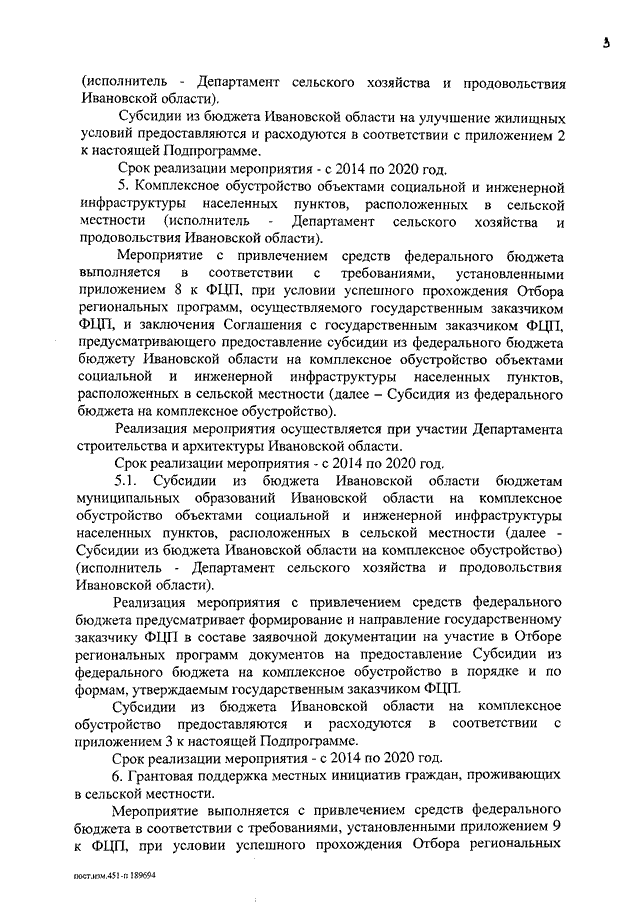 Постановление Правительства Ивановской области от 16.07.2014 N 282-п "О внесении изменений в постановление Правительства Ивановской области от 13.11.2013 N 451-п "Об утверждении государственной программы Ивановской области "Развитие сельского хозяйства и регулирование рынков сельскохозяйственной продукции, сырья и продовольствия Ивановской области" (вместе с "Порядком проведения конкурсного отбора муниципальных образований Ивановской области для участия в подпрограмме "Устойчивое развитие сельских территорий Ивановской области" государственной программы Ивановской области "Развитие сельского хозяйства и регулирование рынков сельскохозяйственной продукции, сырья и продовольствия Ивановской области", "Порядком предоставления и расходования субсидий из бюджета Ивановской области бюджетам муниципальных образований Ивановской области на софинансирование расходных обязательств муниципальных образований по строительству (приобретению) жилья, предоставляемого молодым семьям, молодым специалистам по договору найма жилого помещения", "Порядком предоставления и расходования субсидий из бюджета Ивановской области бюджетам муниципальных образований Ивановской области на комплексное обустройство объектами социальной и инженерной инфраструктуры населенных пунктов, расположенных в сельской местности", "Порядком предоставления и расходования субсидий из бюджета Ивановской области бюджетам муниципальных образований Ивановской области на грантовую поддержку местных инициатив граждан, проживающих в сельской местности")