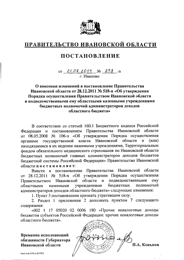 Постановление Правительства Ивановской области от 21.07.2014 N 298-п "О внесении изменений в постановление Правительства Ивановской области от 28.12.2011 N 518-п "Об утверждении Порядка осуществления Правительством Ивановской области и подведомственными ему областными казенными учреждениями бюджетных полномочий администраторов доходов областного бюджета"