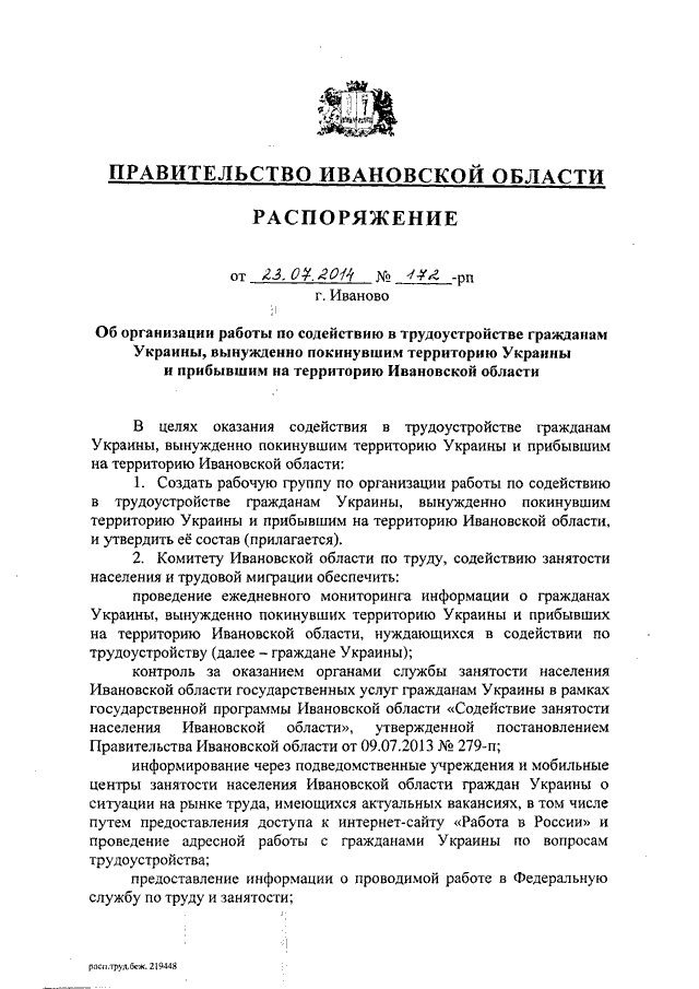 Распоряжение Правительства Ивановской области от 23.07.2014 N 172-рп "Об организации работы по содействию в трудоустройстве гражданам Украины, вынужденно покинувшим территорию Украины и прибывшим на территорию Ивановской области"