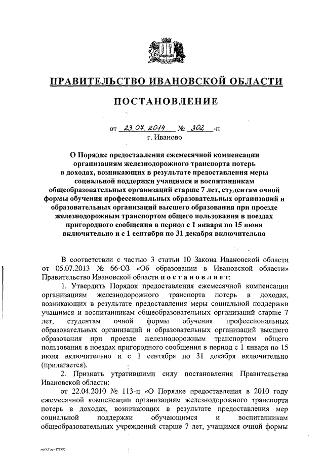 Постановление Правительства Ивановской области от 23.07.2014 N 302-п "О Порядке предоставления ежемесячной компенсации организациям железнодорожного транспорта потерь в доходах, возникающих в результате предоставления меры социальной поддержки учащимся и воспитанникам общеобразовательных организаций старше 7 лет, студентам очной формы обучения профессиональных образовательных организаций и образовательных организаций высшего образования при проезде железнодорожным транспортом общего пользования в поездах пригородного сообщения в период с 1 января по 15 июня включительно и с 1 сентября по 31 декабря включительно"