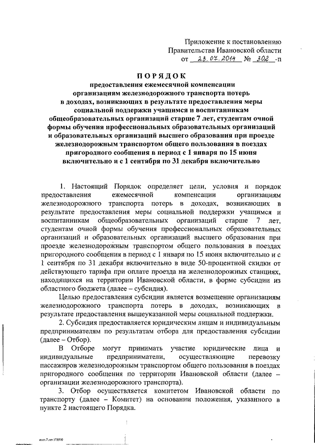 Постановление Правительства Ивановской области от 23.07.2014 N 302-п "О Порядке предоставления ежемесячной компенсации организациям железнодорожного транспорта потерь в доходах, возникающих в результате предоставления меры социальной поддержки учащимся и воспитанникам общеобразовательных организаций старше 7 лет, студентам очной формы обучения профессиональных образовательных организаций и образовательных организаций высшего образования при проезде железнодорожным транспортом общего пользования в поездах пригородного сообщения в период с 1 января по 15 июня включительно и с 1 сентября по 31 декабря включительно"