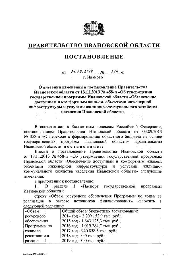 Постановление Правительства Ивановской области от 31.07.2014 N 314-п "О внесении изменений в постановление Правительства Ивановской области от 13.11.2013 N 458-п "Об утверждении государственной программы Ивановской области "Обеспечение доступным и комфортным жильем, объектами инженерной инфраструктуры и услугами жилищно-коммунального хозяйства населения Ивановской области"