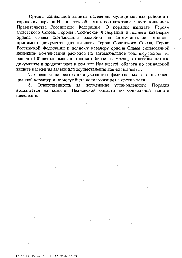 Постановление Правительства Ивановской области от 28.02.2006 N 17-п "Об утверждении Порядка расходования средств федерального бюджета на реализацию мер социальной поддержки Героям Советского Союза, Героям Российской Федерации, полным кавалерам ордена Славы, Героям Социалистического Труда и полным кавалерам ордена Трудовой Славы в 2006 году"