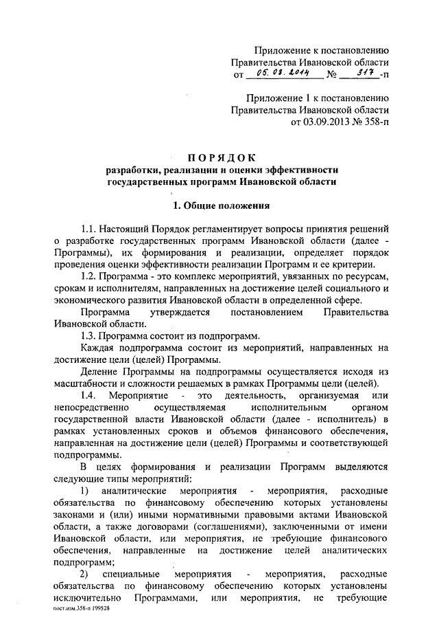 Постановление Правительства Ивановской области от 05.08.2014 N 317-п "О внесении изменения в постановление Правительства Ивановской области от 03.09.2013 N 358-п "О переходе к формированию областного бюджета на основе государственных программ Ивановской области" (вместе с "Порядком разработки, реализации и оценки эффективности государственных программ Ивановской области")