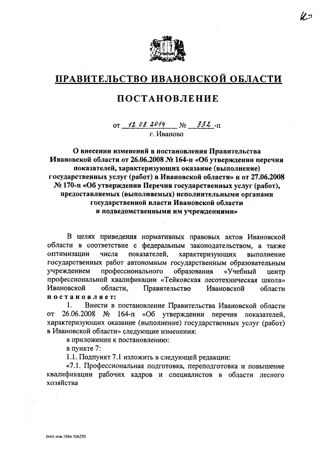 Постановление Правительства Ивановской области от 12.08.2014 N 332-п "О внесении изменений в постановления Правительства Ивановской области от 26.06.2008 N 164-п "Об утверждении перечня показателей, характеризующих оказание (выполнение) государственных услуг (работ) в Ивановской области" и от 27.06.2008 N 170-п "Об утверждении Перечня государственных услуг (работ), предоставляемых (выполняемых) исполнительными органами государственной власти Ивановской области и подведомственными им учреждениями"