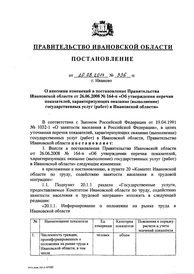 Постановление Правительства Ивановской области от 20.08.2014 N 336-п "О внесении изменений в постановление Правительства Ивановской области от 26.06.2008 N 164-п "Об утверждении перечня показателей, характеризующих оказание (выполнение) государственных услуг (работ) в Ивановской области"