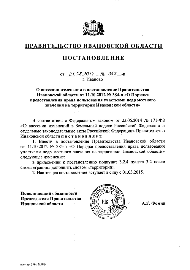 Постановление Правительства Ивановской области от 21.08.2014 N 357-п "О внесении изменения в постановление Правительства Ивановской области от 11.10.2012 N 384-п "О Порядке предоставления права пользования участками недр местного значения на территории Ивановской области"