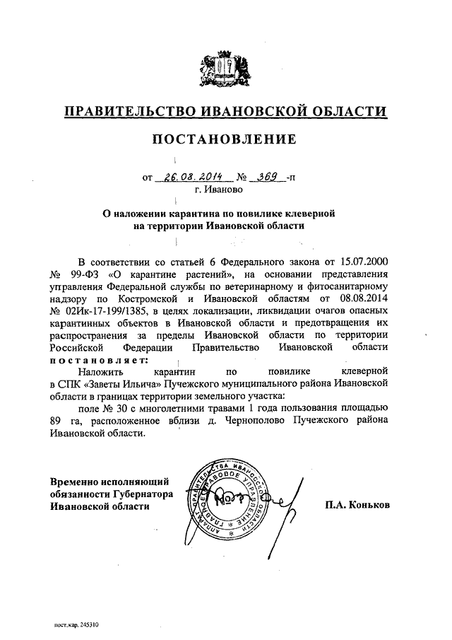 Постановление Правительства Ивановской области от 26.08.2014 N 369-п "О наложении карантина по повилике клеверной на территории Ивановской области"