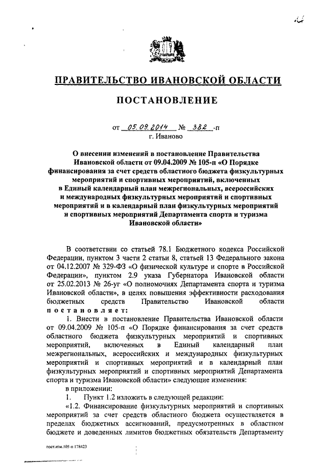 Постановление Правительства Ивановской области от 05.09.2014 N 382-п "О внесении изменений в постановление Правительства Ивановской области от 09.04.2009 N 105-п "О порядке финансирования за счет средств областного бюджета физкультурных мероприятий и спортивных мероприятий, включенных в Единый календарный план межрегиональных, всероссийских и международных физкультурных мероприятий и спортивных мероприятий и в календарный план физкультурных мероприятий и спортивных мероприятий Департамента спорта и туризма Ивановской области"