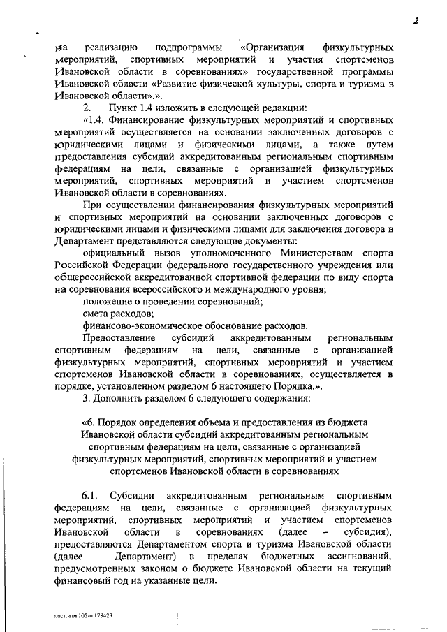 Постановление Правительства Ивановской области от 05.09.2014 N 382-п "О внесении изменений в постановление Правительства Ивановской области от 09.04.2009 N 105-п "О порядке финансирования за счет средств областного бюджета физкультурных мероприятий и спортивных мероприятий, включенных в Единый календарный план межрегиональных, всероссийских и международных физкультурных мероприятий и спортивных мероприятий и в календарный план физкультурных мероприятий и спортивных мероприятий Департамента спорта и туризма Ивановской области"