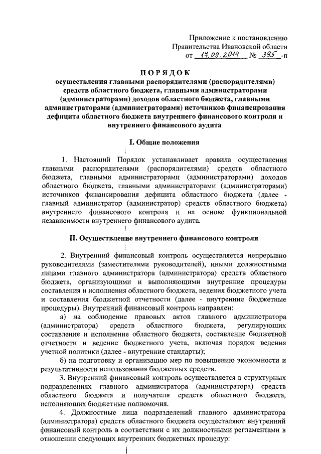 Постановление Правительства Ивановской области от 17.09.2014 N 395-п "Об утверждении Порядка осуществления главными распорядителями (распорядителями) средств областного бюджета, главными администраторами (администраторами) доходов областного бюджета, главными администраторами (администраторами) источников финансирования дефицита областного бюджета внутреннего финансового контроля и внутреннего финансового аудита"