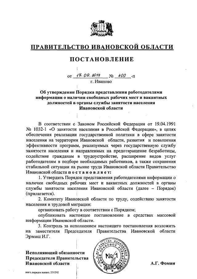 Постановление Правительства Ивановской области от 17.09.2014 N 400-п "Об утверждении Порядка представления работодателями информации о наличии свободных рабочих мест и вакантных должностей в органы службы занятости населения Ивановской области"