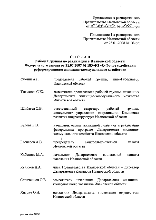 Распоряжение Правительства Ивановской области от 17.09.2014 N 216-рп "О внесении изменения в распоряжение Правительства Ивановской области от 23.01.2008 N 16-рп "О мерах по реализации в Ивановской области Федерального закона от 21.07.2007 N 185-ФЗ "О Фонде содействия реформированию жилищно-коммунального хозяйства"