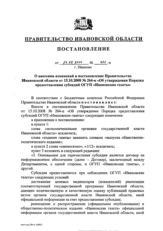 Постановление Правительства Ивановской области от 24.09.2014 N 401-п "О внесении изменений в постановление Правительства Ивановской области от 15.10.2008 N 264-п "Об утверждении Порядка предоставления субсидий ОГУП "Ивановские газеты"