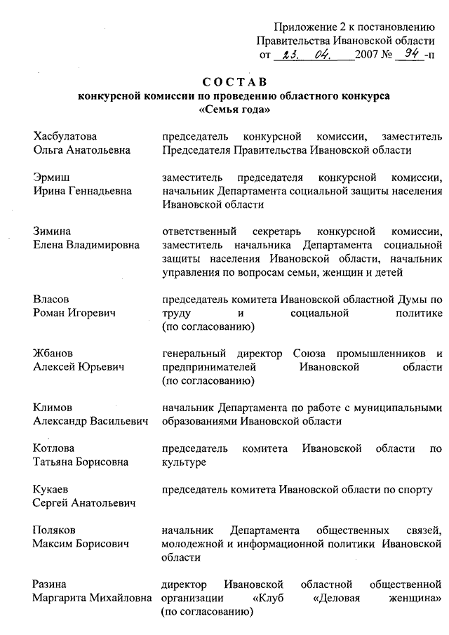 Постановление Правительства Ивановской области от 23.04.2007 N 94-п "О проведении областного конкурса "Семья года" (вместе с "Положением о проведении областного конкурса "Семья года", "Положением о конкурсной комиссии по проведению областного конкурса "Семья года")