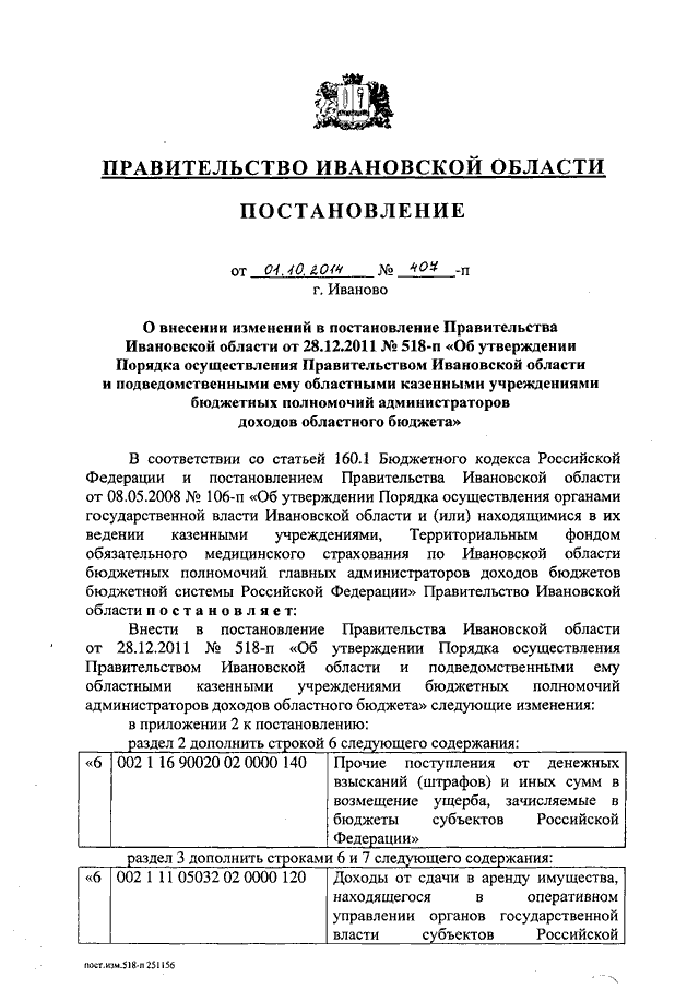 Постановление Правительства Ивановской области от 01.10.2014 N 407-п "О внесении изменений в постановление Правительства Ивановской области от 28.12.2011 N 518-п "Об утверждении Порядка осуществления Правительством Ивановской области и подведомственными ему областными казенными учреждениями бюджетных полномочий администраторов доходов областного бюджета"