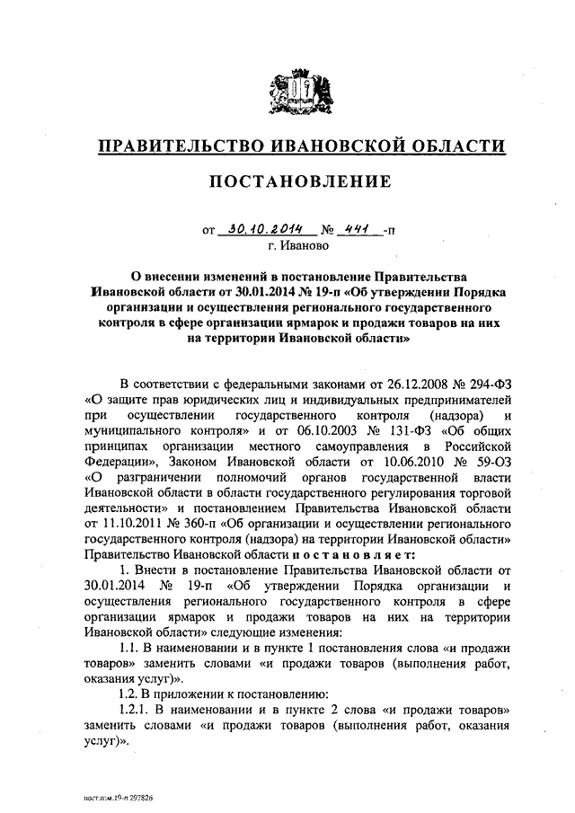 Постановление Правительства Ивановской области от 30.10.2014 N 441-п "О внесении изменений в постановление Правительства Ивановской области от 30.01.2014 N 19-п "Об утверждении Порядка организации и осуществления регионального государственного контроля в сфере организации ярмарок и продажи товаров на них на территории Ивановской области"