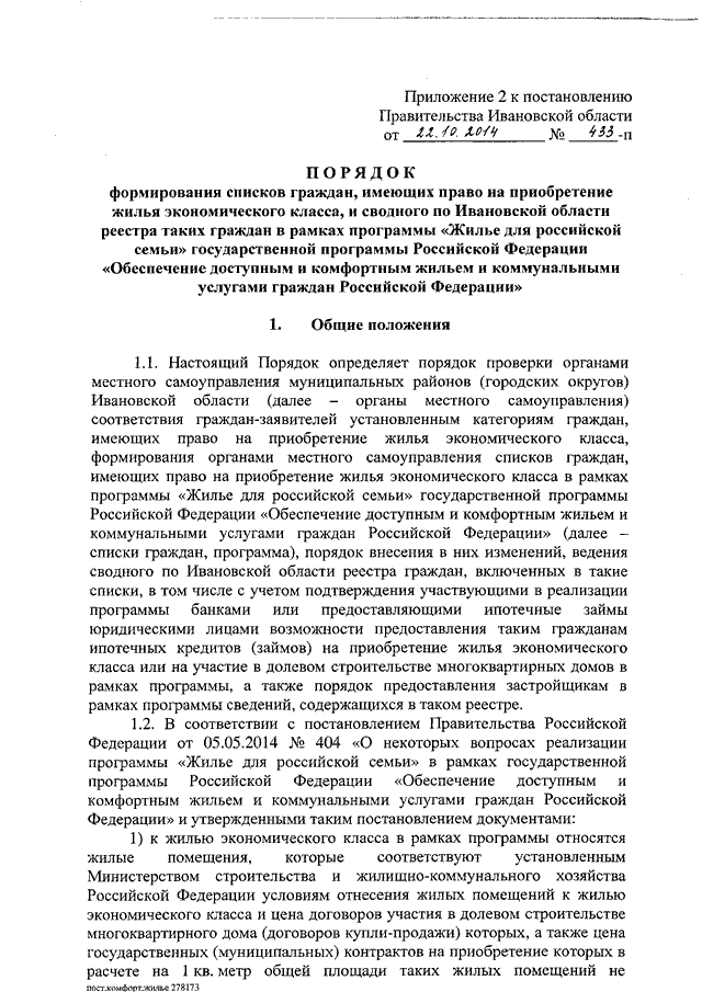 Постановление Правительства Ивановской области от 22.10.2014 N 433-п "Об утверждении перечня категорий граждан, имеющих право на приобретение жилья экономического класса, Порядка формирования списков граждан, имеющих право на приобретение жилья экономического класса, и сводного по Ивановской области реестра таких граждан в рамках программы "Жилье для российской семьи" государственной программы Российской Федерации "Обеспечение доступным и комфортным жильем и коммунальными услугами граждан Российской Федерации" (вместе с "Перечнем категорий граждан, имеющих право на приобретение жилья экономического класса в рамках программы "Жилье для российской семьи" государственной программы Российской Федерации "Обеспечение доступным и комфортным жильем и коммунальными услугами граждан Российской Федерации" на территории Ивановской области")