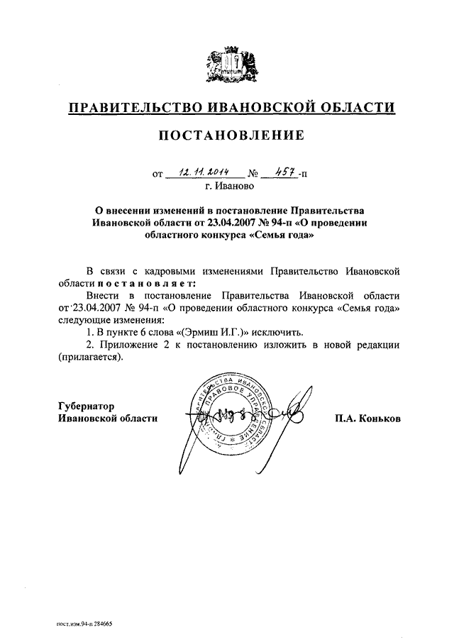 Постановление Правительства Ивановской области от 12.11.2014 N 457-п "О внесении изменений в постановление Правительства Ивановской области от 23.04.2007 N 94-п "О проведении областного конкурса "Семья года"
