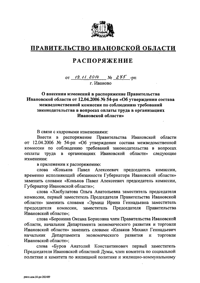 Распоряжение Правительства Ивановской области от 19.11.2014 N 275-рп "О внесении изменений в распоряжение Правительства Ивановской области от 12.04.2006 N 54-рп "Об утверждении состава межведомственной комиссии по соблюдению требований законодательства в вопросах оплаты труда в организациях Ивановской области"