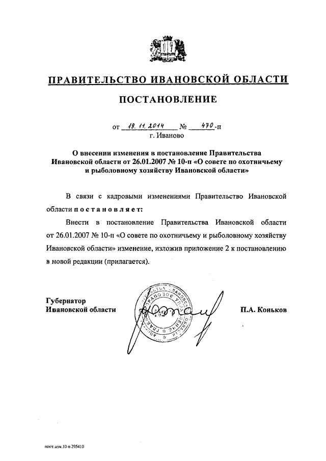 Постановление Правительства Ивановской области от 19.11.2014 N 470-п "О внесении изменения в постановление Правительства Ивановской области от 26.01.2007 N 10-п "О совете по охотничьему и рыболовному хозяйству Ивановской области"