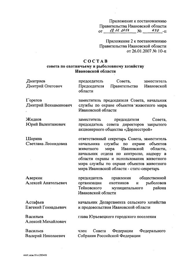 Постановление Правительства Ивановской области от 19.11.2014 N 470-п "О внесении изменения в постановление Правительства Ивановской области от 26.01.2007 N 10-п "О совете по охотничьему и рыболовному хозяйству Ивановской области"