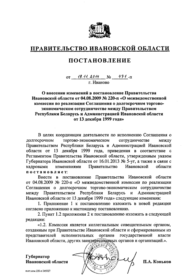 Постановление Правительства Ивановской области от 19.11.2014 N 471-п "О внесении изменений в постановление Правительства Ивановской области от 04.08.2009 N 220-п "О межведомственной комиссии по реализации Соглашения о долгосрочном торгово-экономическом сотрудничестве между Правительством Республики Беларусь и Администрацией Ивановской области от 13 декабря 1999 года"