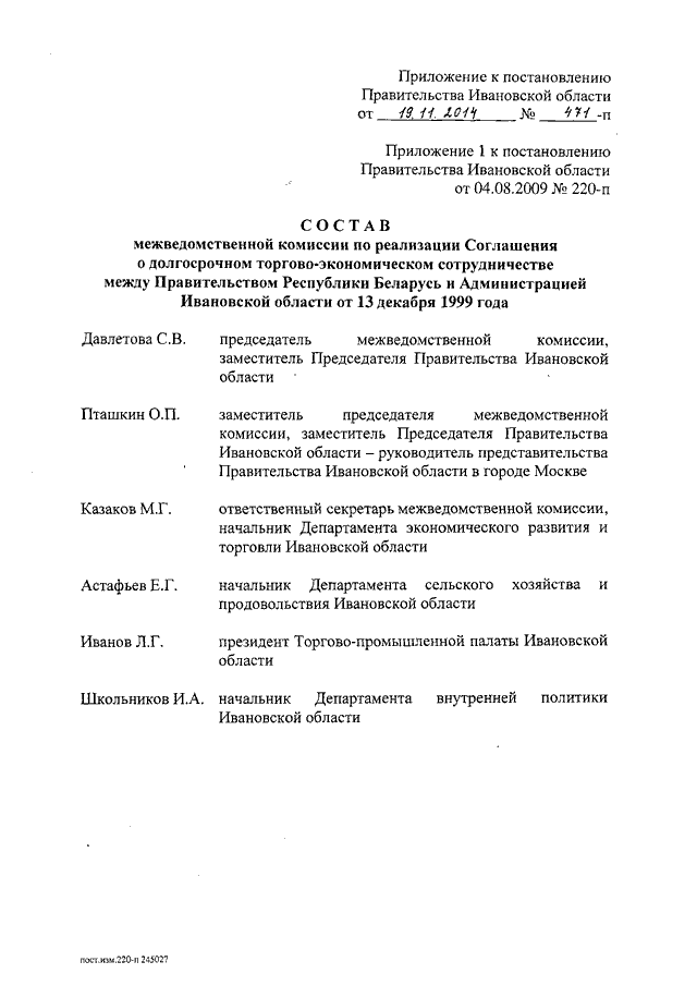 Постановление Правительства Ивановской области от 19.11.2014 N 471-п "О внесении изменений в постановление Правительства Ивановской области от 04.08.2009 N 220-п "О межведомственной комиссии по реализации Соглашения о долгосрочном торгово-экономическом сотрудничестве между Правительством Республики Беларусь и Администрацией Ивановской области от 13 декабря 1999 года"