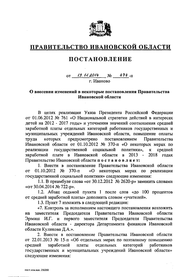 Постановление Правительства Ивановской области от 19.11.2014 N 474-п "О внесении изменений в некоторые постановления Правительства Ивановской области"