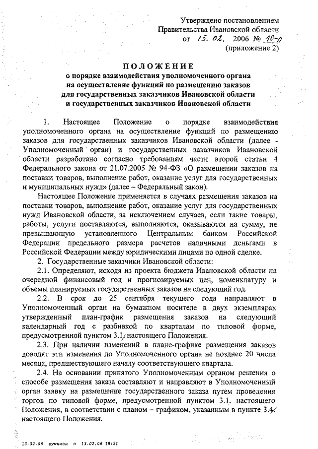 Постановление Правительства Ивановской области от 15.02.2006 N 10-п "О создании Департамента конкурсов и аукционов Ивановской области" (вместе с "Положением о Департаменте конкурсов и аукционов Ивановской области", "Положением о порядке взаимодействия уполномоченного органа на осуществление функций по размещению заказов для государственных заказчиков Ивановской области и государственных заказчиков Ивановской области")