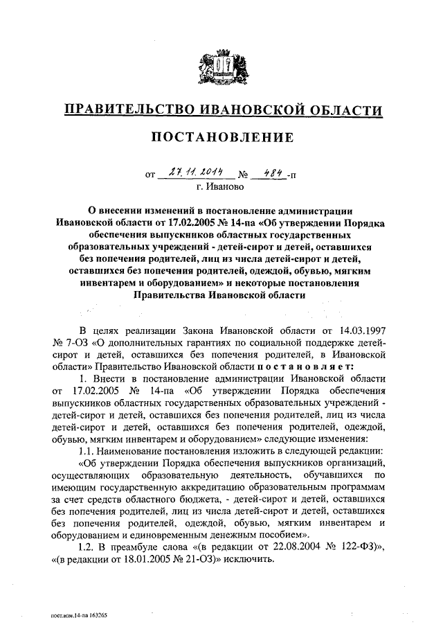 Постановление Правительства Ивановской области от 27.11.2014 N 484-п "О внесении изменений в постановление администрации Ивановской области от 17.02.2005 N 14-па "Об утверждении Порядка обеспечения выпускников областных государственных образовательных учреждений - детей-сирот и детей, оставшихся без попечения родителей, лиц из числа детей-сирот и детей, оставшихся без попечения родителей, одеждой, обувью, мягким инвентарем и оборудованием" и некоторые постановления Правительства Ивановской области"