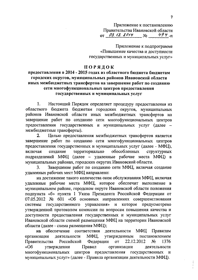 Постановление Правительства Ивановской области от 03.12.2014 N 494-п "О внесении изменений в постановление Правительства Ивановской области от 13.11.2013 N 454-п "Об утверждении государственной программы Ивановской области "Совершенствование институтов государственного управления и местного самоуправления Ивановской области" (вместе с "Порядком предоставления в 2014 - 2015 годах из областного бюджета бюджетам городских округов, муниципальных районов Ивановской области иных межбюджетных трансфертов на завершение работ по созданию сети многофункциональных центров предоставления государственных и муниципальных услуг")