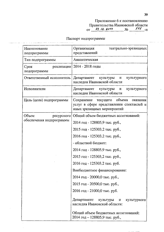 Постановление Правительства Ивановской области от 03.12.2014 N 505-п "О внесении изменений в постановление Правительства Ивановской области от 13.11.2013 N 453-п "Об утверждении государственной программы Ивановской области "Культура Ивановской области" (вместе с "Паспортом подпрограммы")
