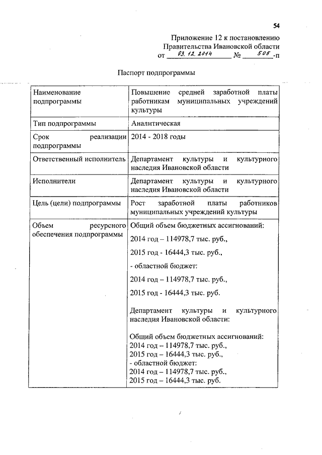 Постановление Правительства Ивановской области от 03.12.2014 N 505-п "О внесении изменений в постановление Правительства Ивановской области от 13.11.2013 N 453-п "Об утверждении государственной программы Ивановской области "Культура Ивановской области" (вместе с "Паспортом подпрограммы")