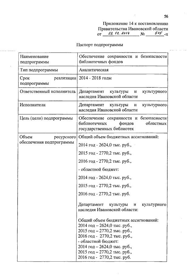Постановление Правительства Ивановской области от 03.12.2014 N 505-п "О внесении изменений в постановление Правительства Ивановской области от 13.11.2013 N 453-п "Об утверждении государственной программы Ивановской области "Культура Ивановской области" (вместе с "Паспортом подпрограммы")