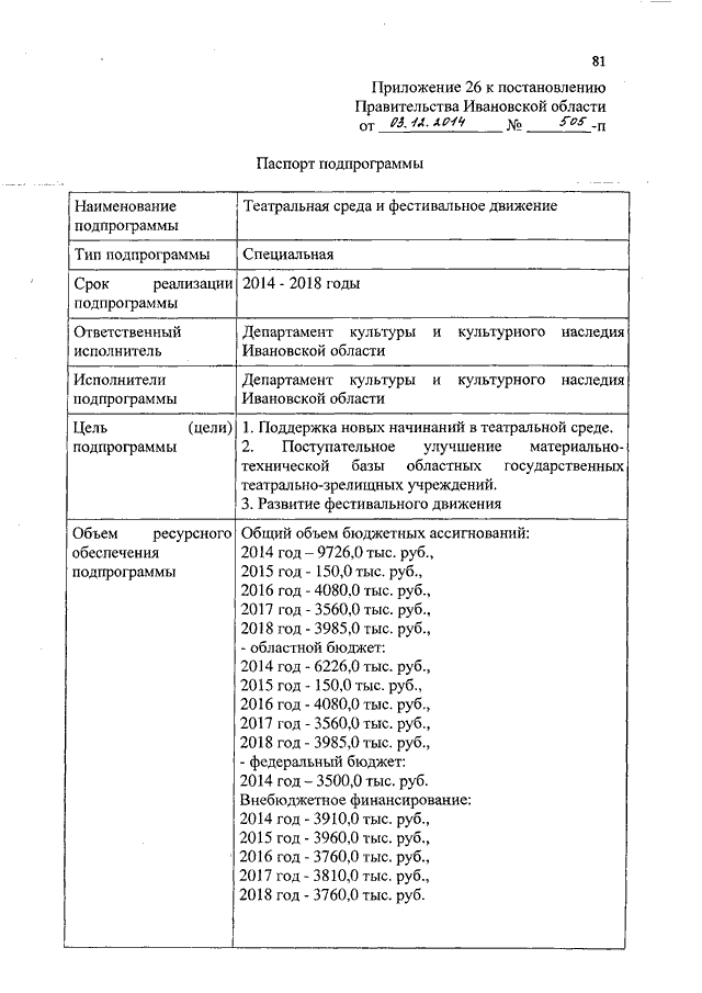 Постановление Правительства Ивановской области от 03.12.2014 N 505-п "О внесении изменений в постановление Правительства Ивановской области от 13.11.2013 N 453-п "Об утверждении государственной программы Ивановской области "Культура Ивановской области" (вместе с "Паспортом подпрограммы")