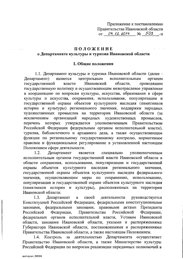 Постановление Правительства Ивановской области от 04.12.2014 N 507-п "Об утверждении Положения о Департаменте культуры и туризма Ивановской области"
