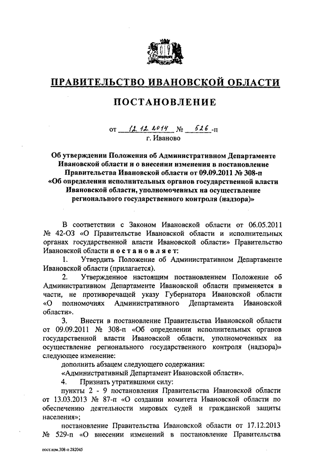 Постановление Правительства Ивановской области от 12.12.2014 N 526-п "Об утверждении Положения об Административном Департаменте Ивановской области и о внесении изменения в постановление Правительства Ивановской области от 09.09.2011 N 308-п "Об определении исполнительных органов государственной власти Ивановской области, уполномоченных на осуществление регионального государственного контроля (надзора)"