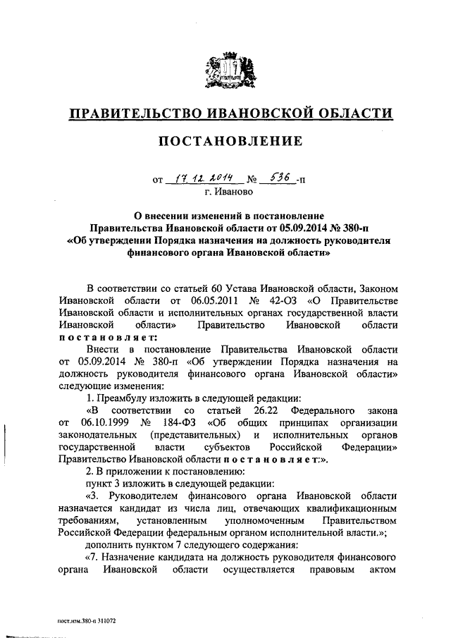Постановление Правительства Ивановской области от 17.12.2014 N 536-п "О внесении изменений в постановление Правительства Ивановской области от 05.09.2014 N 380-п "Об утверждении Порядка назначения на должность руководителя финансового органа Ивановской области"
