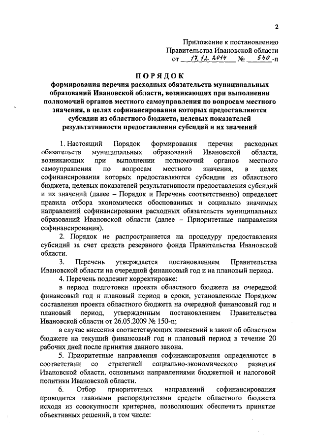 Постановление Правительства Ивановской области от 17.12.2014 N 540-п "Об утверждении Порядка формирования перечня расходных обязательств муниципальных образований Ивановской области, возникающих при выполнении полномочий органов местного самоуправления по вопросам местного значения, в целях софинансирования которых предоставляются субсидии из областного бюджета, целевых показателей результативности предоставления субсидий и их значений"
