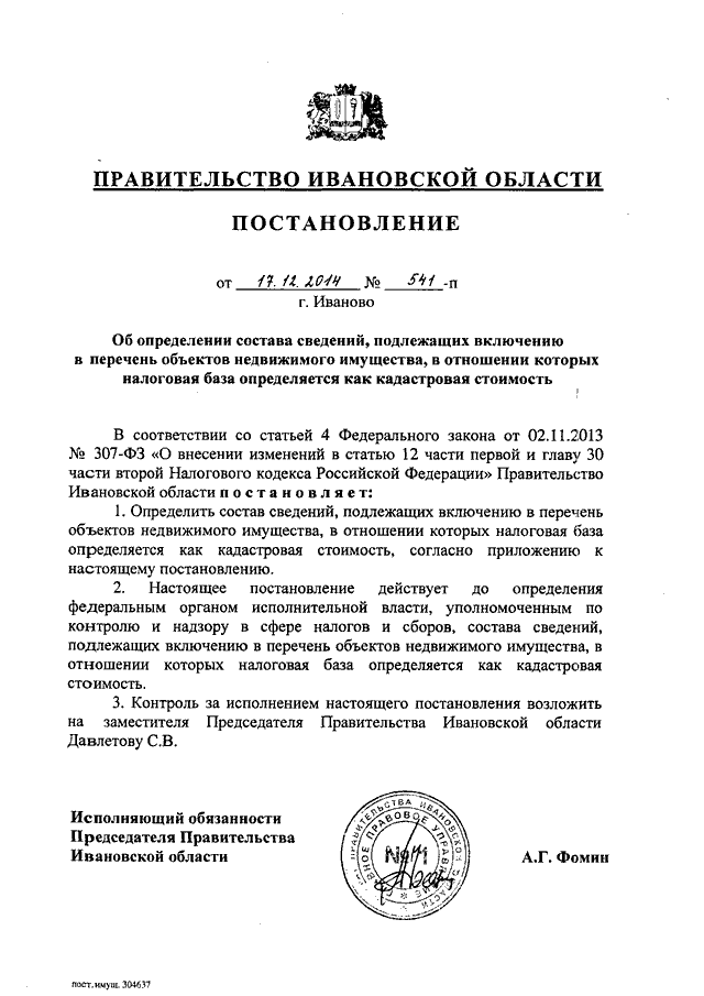 Постановление Правительства Ивановской области от 17.12.2014 N 541-п "Об определении состава сведений, подлежащих включению в перечень объектов недвижимого имущества, в отношении которых налоговая база определяется как кадастровая стоимость"