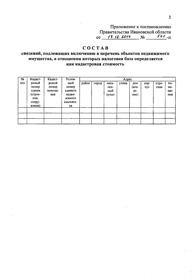 Постановление Правительства Ивановской области от 17.12.2014 N 541-п "Об определении состава сведений, подлежащих включению в перечень объектов недвижимого имущества, в отношении которых налоговая база определяется как кадастровая стоимость"