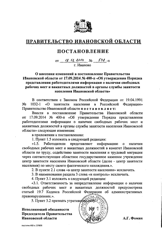 Постановление Правительства Ивановской области от 18.12.2014 N 548-п "О внесении изменений в постановление Правительства Ивановской области от 17.09.2014 N 400-п "Об утверждении Порядка представления работодателями информации о наличии свободных рабочих мест и вакантных должностей в органы службы занятости населения Ивановской области"