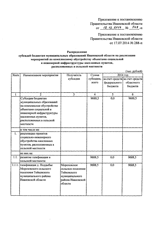 Постановление Правительства Ивановской области от 18.12.2014 N 549-п "О внесении изменения в постановление Правительства Ивановской области от 17.07.2014 N 288-п "О распределении субсидий бюджетам муниципальных образований Ивановской области на реализацию мероприятий по комплексному обустройству объектами социальной и инженерной инфраструктуры населенных пунктов, расположенных в сельской местности"