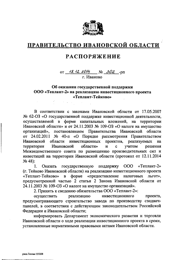 Распоряжение Правительства Ивановской области от 18.12.2014 N 302-рп "Об оказании государственной поддержки ООО "Теплант-2" на реализацию инвестиционного проекта "Теплант-Тейково"