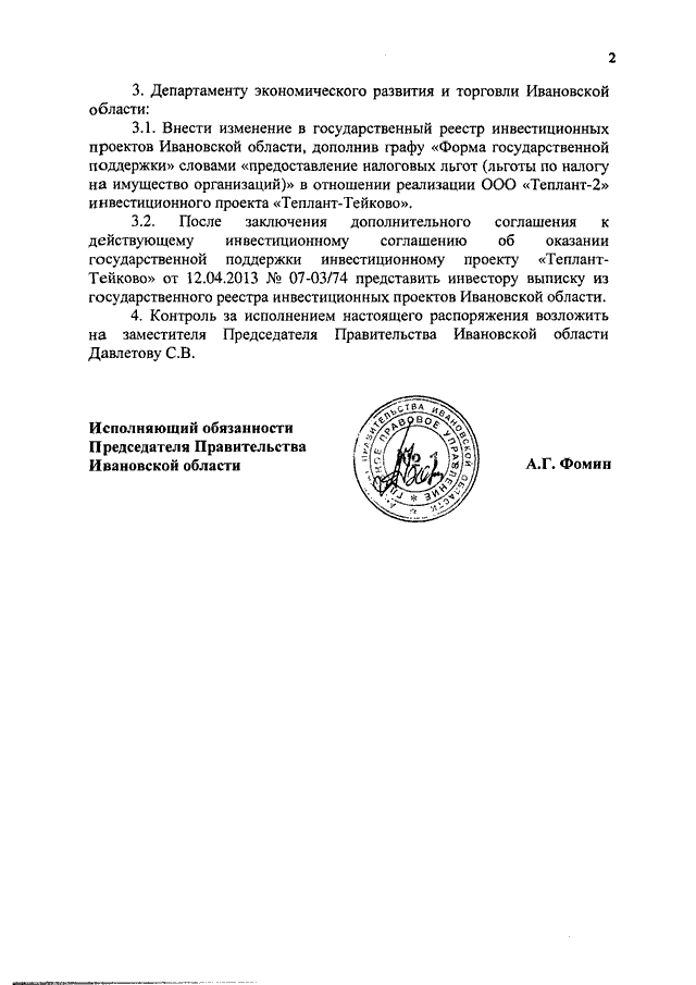Распоряжение Правительства Ивановской области от 18.12.2014 N 302-рп "Об оказании государственной поддержки ООО "Теплант-2" на реализацию инвестиционного проекта "Теплант-Тейково"