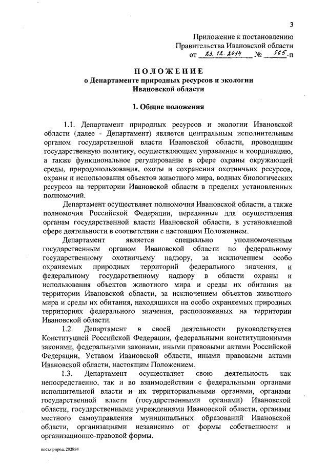 Постановление Правительства Ивановской области от 23.12.2014 N 565-п "Об утверждении Положения о Департаменте природных ресурсов и экологии Ивановской области"