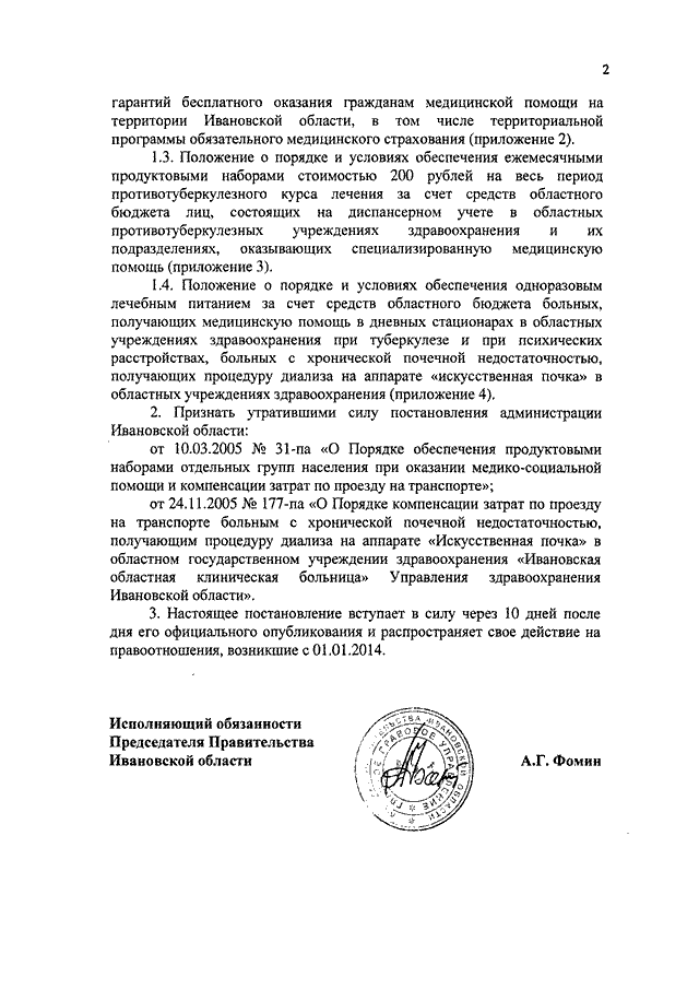 Постановление Правительства Ивановской области от 24.12.2014 N 574-п "О порядке и условиях предоставления мер социальной поддержки отдельным группам населения при оказании медицинской помощи" (вместе с "Положением о порядке и условиях компенсации стоимости проезда за счет средств областного бюджета до места обследования (консультации) или лечения (туда и обратно) на транспорте городского, пригородного и межмуниципального сообщения лицам, направленным медицинскими организациями, подведомственными исполнительному органу государственной власти Ивановской области в сфере охраны здоровья граждан, на обязательное обследование (консультацию) или лечение в областные противотуберкулезные учреждения или их подразделения, а также компенсации стоимости проезда за счет средств областного бюджета до места обследования (консультации) или лечения (туда и обратно) на транспорте городского, пригородного и межмуниципального сообщения 1 раз в год лицам, направленным областными учреждениями здравоохранения на обязательное обследование (консультацию) или лечение в противотуберкулезные учреждения или их подразделения других субъектов Российской Федерации", "Положением о порядке и условиях компенсации затрат за счет средств областного бюджета по проезду на транспорте общего пользования междугороднего и пригородного сообщения к месту получения процедуры диализа на аппарате "искусственная почка" и обратно больным с хронической почечной недостаточностью, получающим данную процедуру в медицинских организациях, участвующих в реализации территориальной программы государственных гарантий бесплатного оказания гражданам медицинской помощи на территории Ивановской области, в том числе территориальной программы обязательного медицинского страхования", "Положением о порядке и условиях обеспечения ежемесячными продуктовыми наборами стоимостью 200 рублей на весь период противотуберкулезного курса лечения за счет средств областного бюджета лиц, состоящих на диспансерном учете в областных противотуберкулезных учреждениях здравоохранения и их подразделениях, оказывающих специализированную медицинскую помощь", "Положением о порядке и условиях обеспечения одноразовым лечебным питанием за счет средств областного бюджета больных, получающих медицинскую помощь в дневных стационарах в областных учреждениях здравоохранения при туберкулезе и при психических расстройствах, больных с хронической почечной недостаточностью, получающих процедуру диализа на аппарате "искусственная почка" в областных учреждениях здравоохранения")