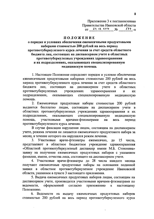 Постановление Правительства Ивановской области от 24.12.2014 N 574-п "О порядке и условиях предоставления мер социальной поддержки отдельным группам населения при оказании медицинской помощи" (вместе с "Положением о порядке и условиях компенсации стоимости проезда за счет средств областного бюджета до места обследования (консультации) или лечения (туда и обратно) на транспорте городского, пригородного и межмуниципального сообщения лицам, направленным медицинскими организациями, подведомственными исполнительному органу государственной власти Ивановской области в сфере охраны здоровья граждан, на обязательное обследование (консультацию) или лечение в областные противотуберкулезные учреждения или их подразделения, а также компенсации стоимости проезда за счет средств областного бюджета до места обследования (консультации) или лечения (туда и обратно) на транспорте городского, пригородного и межмуниципального сообщения 1 раз в год лицам, направленным областными учреждениями здравоохранения на обязательное обследование (консультацию) или лечение в противотуберкулезные учреждения или их подразделения других субъектов Российской Федерации", "Положением о порядке и условиях компенсации затрат за счет средств областного бюджета по проезду на транспорте общего пользования междугороднего и пригородного сообщения к месту получения процедуры диализа на аппарате "искусственная почка" и обратно больным с хронической почечной недостаточностью, получающим данную процедуру в медицинских организациях, участвующих в реализации территориальной программы государственных гарантий бесплатного оказания гражданам медицинской помощи на территории Ивановской области, в том числе территориальной программы обязательного медицинского страхования", "Положением о порядке и условиях обеспечения ежемесячными продуктовыми наборами стоимостью 200 рублей на весь период противотуберкулезного курса лечения за счет средств областного бюджета лиц, состоящих на диспансерном учете в областных противотуберкулезных учреждениях здравоохранения и их подразделениях, оказывающих специализированную медицинскую помощь", "Положением о порядке и условиях обеспечения одноразовым лечебным питанием за счет средств областного бюджета больных, получающих медицинскую помощь в дневных стационарах в областных учреждениях здравоохранения при туберкулезе и при психических расстройствах, больных с хронической почечной недостаточностью, получающих процедуру диализа на аппарате "искусственная почка" в областных учреждениях здравоохранения")
