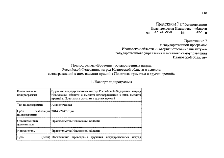 Постановление Правительства Ивановской области от 31.12.2014 N 591-п "О внесении изменений в постановление Правительства Ивановской области от 13.11.2013 N 454-п "Об утверждении государственной программы Ивановской области "Совершенствование институтов государственного управления и местного самоуправления Ивановской области" (вместе с "Подпрограммой "Обеспечение деятельности органов государственной власти Ивановской области", "Подпрограммой "Информационная открытость органов государственной власти Ивановской области", "Подпрограммой "Общественный контроль и экспертная поддержка органов государственной власти Ивановской области", "Подпрограммой "Поддержка социально ориентированных некоммерческих организаций", "Подпрограммой "Укрепление кадрового потенциала государственной службы Ивановской области", "Подпрограммой "Организация дополнительного пенсионного обеспечения отдельных категорий граждан", "Подпрограммой "Вручение государственных наград Российской Федерации, наград Ивановской области и выплата вознаграждений к ним, выплата премий к Почетным грамотам и других премий", "Подпрограммой "Эффективный муниципалитет", "Подпрограммой "Оценка регулирующего воздействия", "Подпрограммой "Организация предоставления государственных и муниципальных услуг на базе областного государственного бюджетного учреждения "Многофункциональный центр предоставления государственных и муниципальных услуг", "Подпрограммой "Организационная и консультационная поддержка национально-культурных автономий и общественных организаций", "Подпрограммой "Обеспечение деятельности мировых судей и аппаратов мировых судей Ивановской области")
